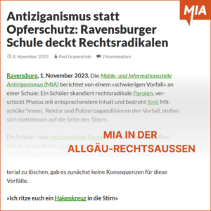 Ravensburg, 1. November 2023. Die Melde- und Informationsstelle Antiziganismus (MIA) berichtet von einem »schwierigen Vorfall« an einer Schule: Ein Schüler skandiert rechtsradikale Parolen, verschickt Photos mit entsprechendem Inhalt und bedroht Sinti Mitschüler*innen.  Rektor und Polizei bagatellisieren den Vorfall, stellen sich stattdessen auf die Seite des Täters.